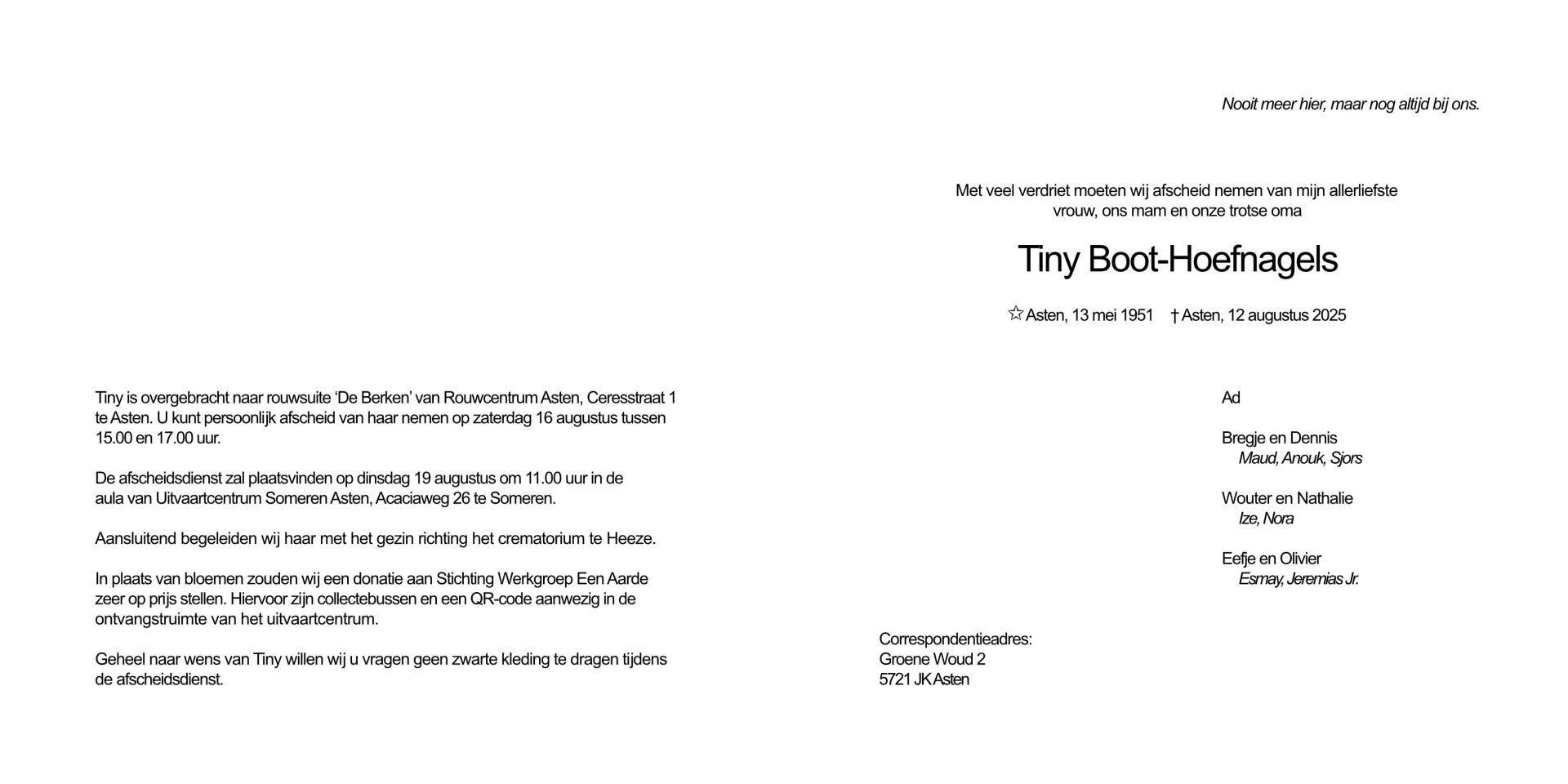 16 augustus 2025, Onze vrijwilligster Tiny Boot-Hoefnagels is op dinsdag, 12 augustus, overleden.